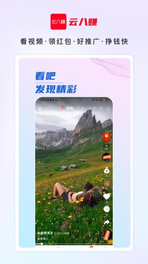 云八赚app(原名:吧中吧)是一款新型线上直播购物软件,丰富的生活购物场景,集电商购物、美食外卖、生活团购等诸多服务,所有你想要体验的吃喝玩乐都能在这里找到,帮助你轻松发现周边的美食和服务,并能到线下进行体验,享受优质的服务;并且,云八赚官网版app每天还有各种大礼包和优惠活动推送,可实时在线参与购物,帮助你花更少的钱就能买到优质好物,购物更加的愉快;并且,在线看视频和推广,还能抢红包转福利,看视频越多,邀请的好友越多,可以享受丰厚红包奖励,不仅能在线消费购物,还能轻松赚到丰厚的零花钱。