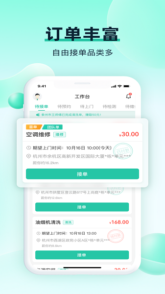 为到家服务打造的一款接单工具,适用于手机数码维修、家电维修清洗安装、家政保洁等各种到家服务。