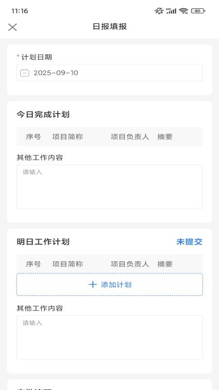 5、在日报填写界面,可轻松添加记录自己当天和明天的工作计划;