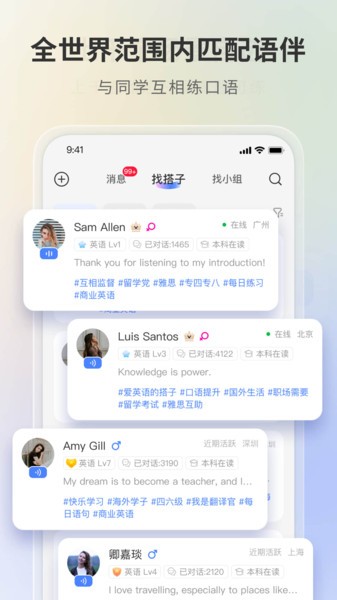 语有灵犀客户端这是一个专业用来学习外语的线上练习助手。软件内提供了丰富的课程资源,用户可根据需要来定制一个适合自己的学习计划,通过训练让自己的口语能力更上一层!