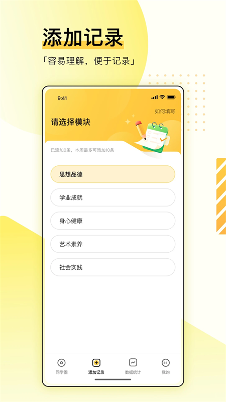 1、首先,打开综评学生端后,您会看到主界面上有一个“添加记录”的选项。点击该选项以便开始添加评价记录。