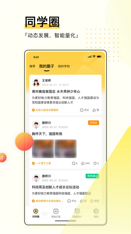 1、查看同学圈记录数据,查看本校其它学生记录数据时,可以提出质疑、发表评论、点赞、查看详情等操作。