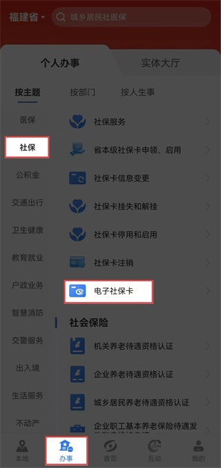 登录闽政通APP,在【办事】页点击【社保】模块,在【社保卡】栏下选择【电子社保卡】。