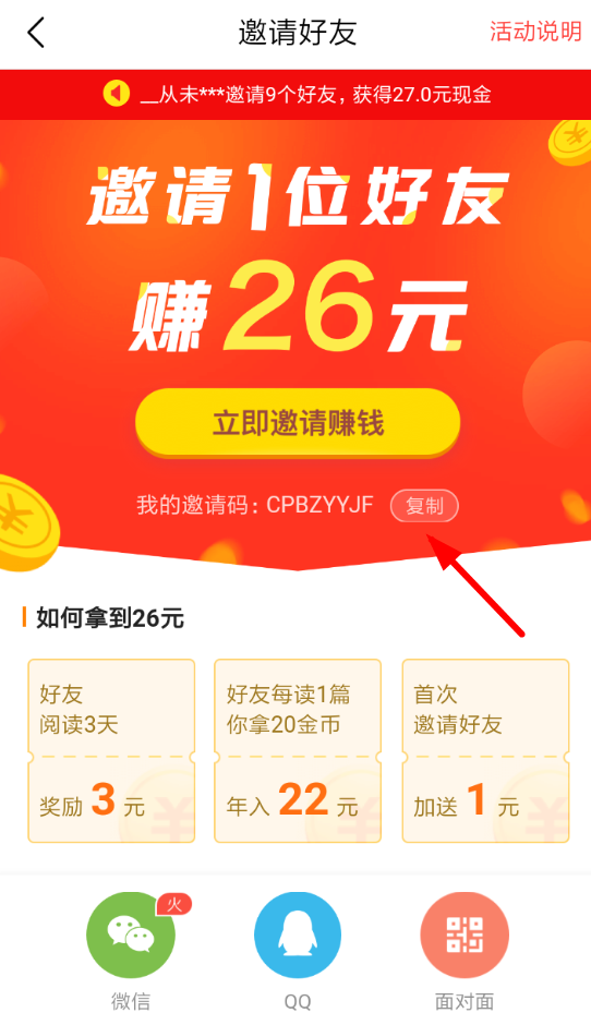6、邀请好友填写你的邀请码,以后它每次阅读文章也会给你双倍的阅读金币,而且邀请好友还可以获取额外的1元奖励!