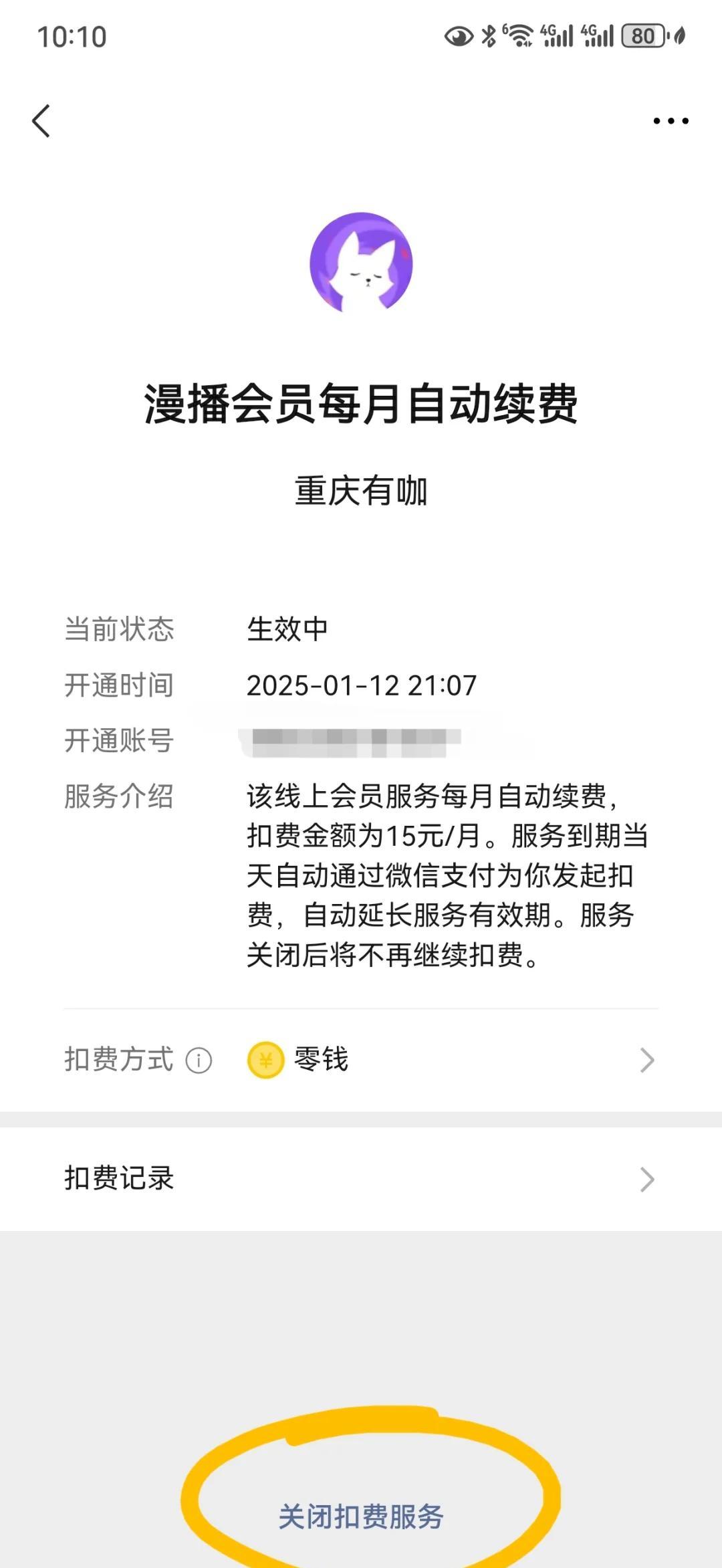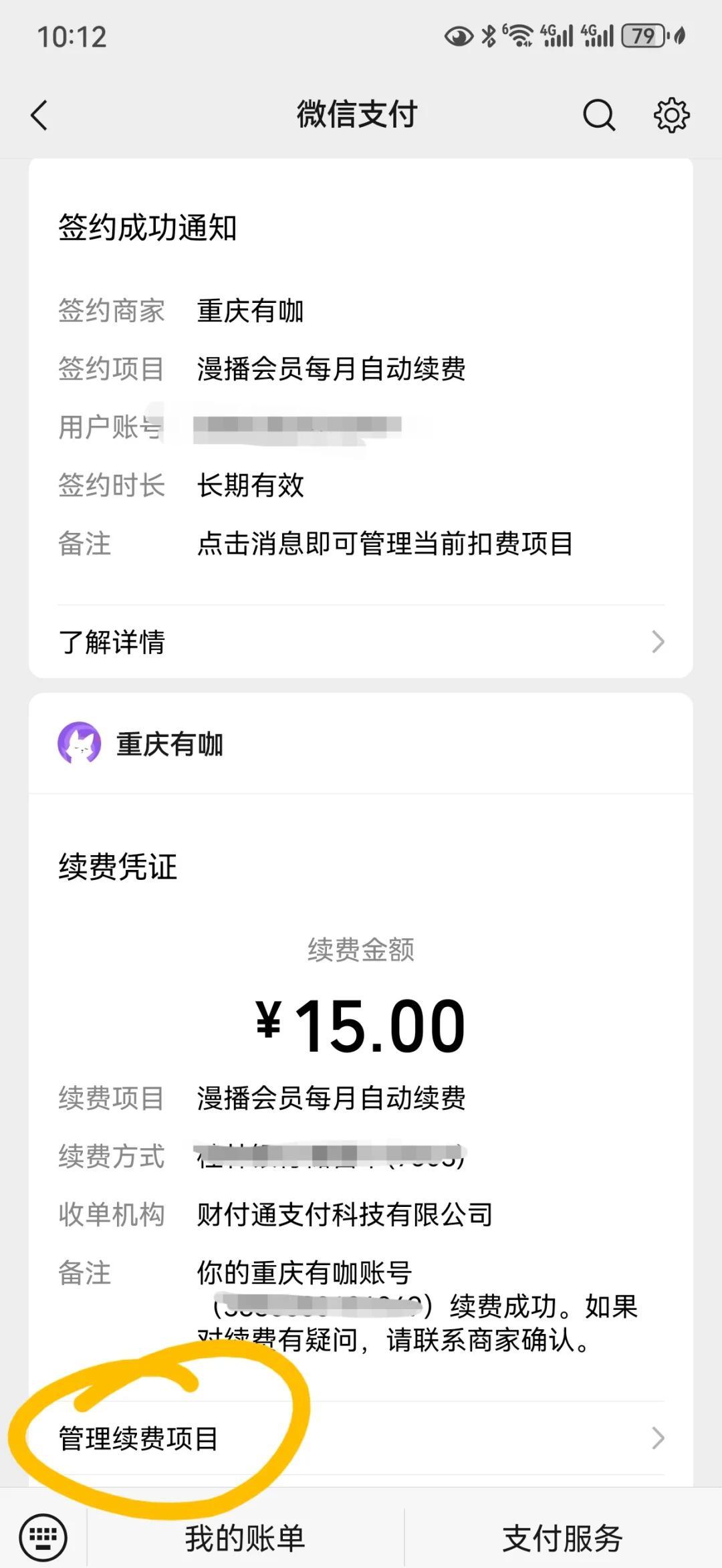 2.如果你还没有到期,也没有收到续费提醒,那就需要去支付记录里找到“管理续费项目”,然后关闭它。