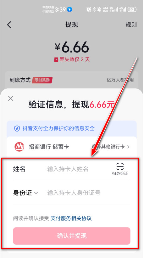 6.输入持卡人姓名和身份证号码,再点击确认并提现即可。