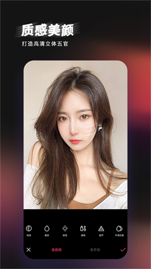 一键美颜+手动细节,肤质自然细腻,妆容更服帖。