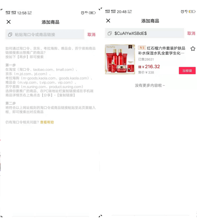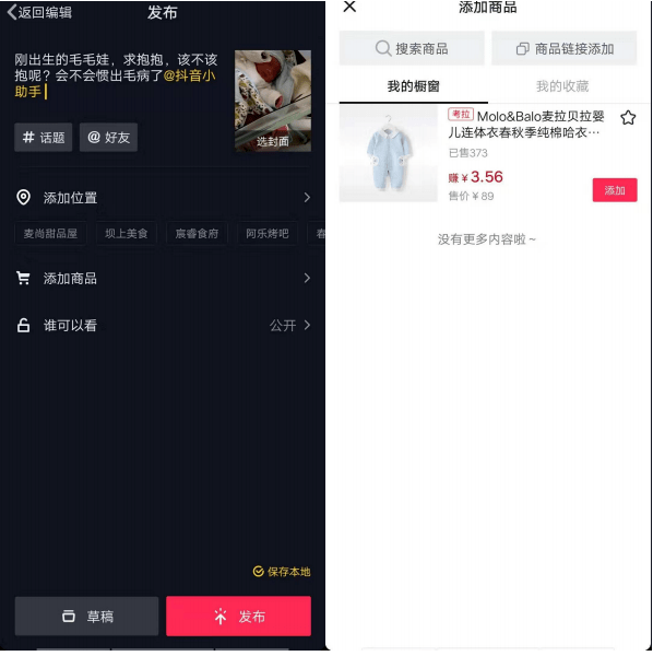 用户在录制上传抖音的过程中,点击【添加商品】,在【我的橱窗】里添加已有的商品,或者在搜索框内添加商品的淘口令。当编辑完成后,发布上传视频,完成添加购物车操作。