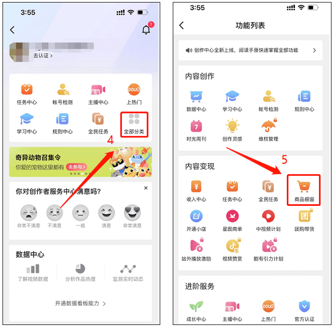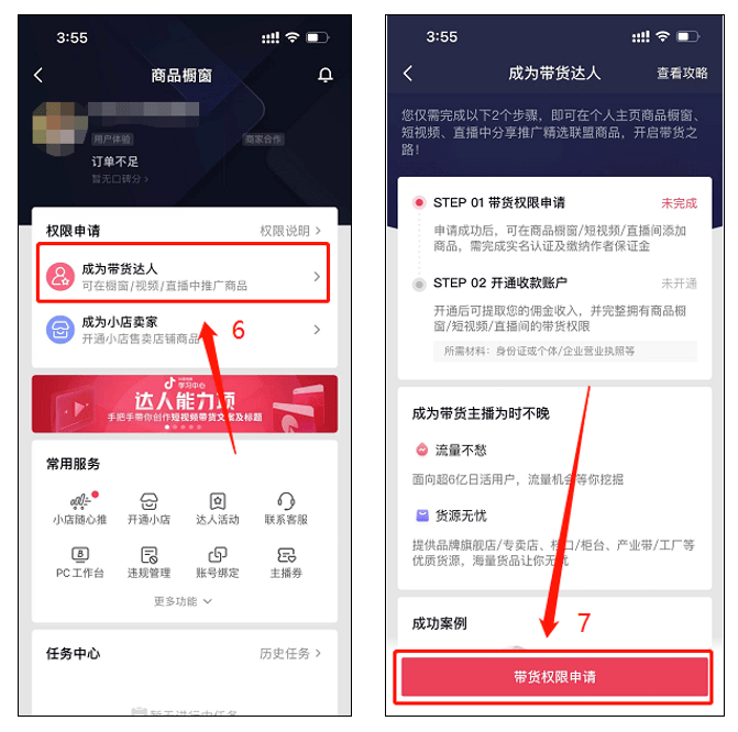 ★开通途径:打开抖音APP,依次点击 【我】― 【创作者服务中心】― 【全部分类】― 【商品橱窗】― 【成为带货达人】― 【带货权限申请】―确认符合4个开通要求后,点击 【立即申请】即可。