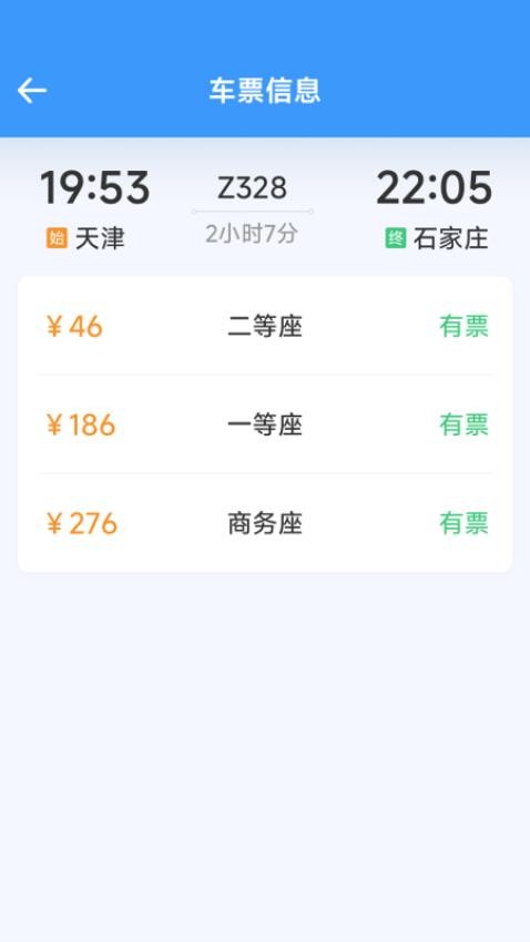 展示了与铁路局实时同步的车票数据信息,用户可以掌握最新的余票动态,轻松查看了解。