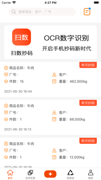软件有四种抄码方式:手动输入,OCR扫数,语音输入,扫码枪输入。扫码枪输入需要您自行购买扫码枪。语音输入建议您慢慢读出数字,多次使用可以提高识别的准确度。扫数输入需要将净重数字尽量对准红色“十字”中心,按下“扫数”按钮即可,如果您的商品无法扫描请联系客服。