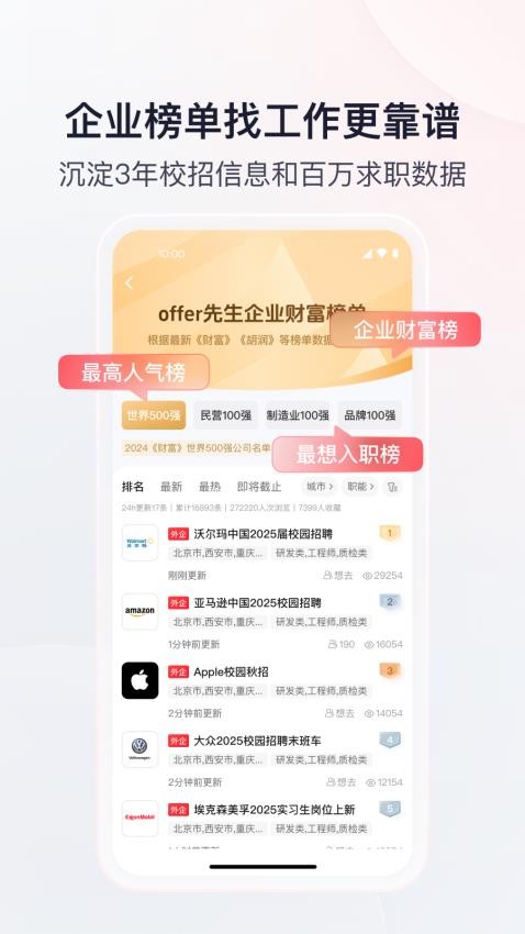 为你提供了真实的企业招聘榜单,你可以获取各种热门职位、热门企业等信息;