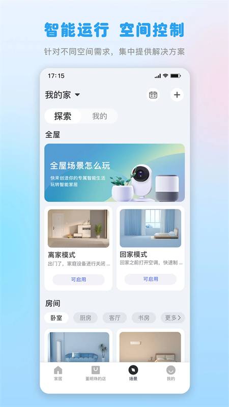3、支持多种生活场景操控模式,回家、离家、早晨、夜晚各不相同。