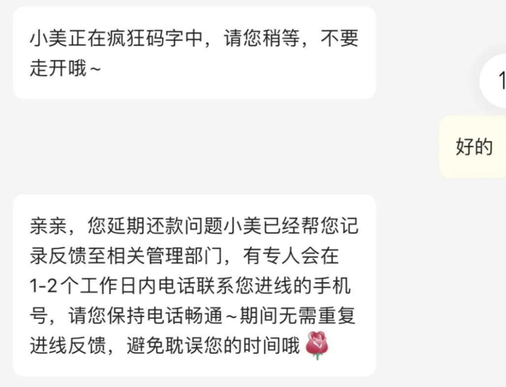 我们联系客服后说明需要办理延期还款,客服会让你提供姓名及身份证前三后二的数字,然后回复消息说反馈给相关部门回电。(如下图)