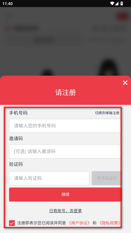 4.请按照软件的要求输入以下的信息,勾选注册即表示您已阅读并同意《用户协议》和《隐私政策》,然后点击继续,接着按照软件的提示操作即可注册完成。