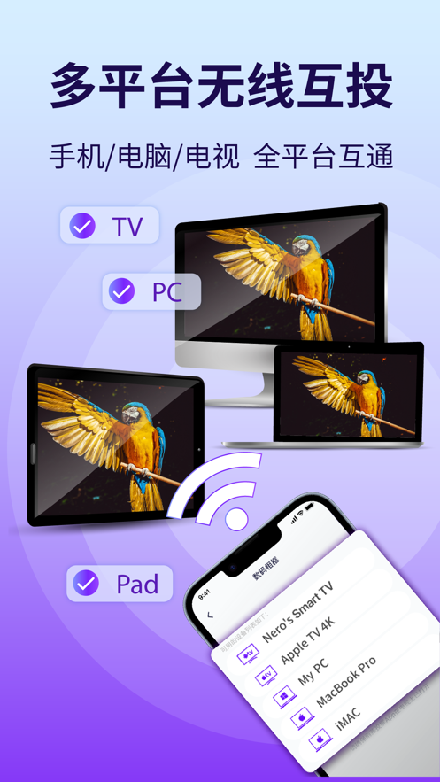 支持多端互投,提供iOS、Mac、Windows、Apple TV以及TV版本,帮助你实现手机投屏电视、手机投屏电脑、电脑投屏电视等投屏方式。支持多画质投屏,“标清”、“高清”、“超清”任由您选择!自动帮你搜索附近的可投屏设备,想投哪个就投哪个 。温馨提示:搜索不到设备时,试试扫码连接!