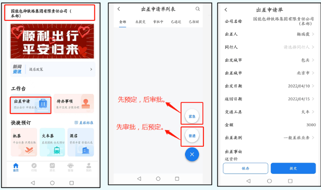 商旅平台同时配置了“紧急”类型申请单,紧急情况下,提报申请单后,即可在商旅平台预订资源,后补审批手续。