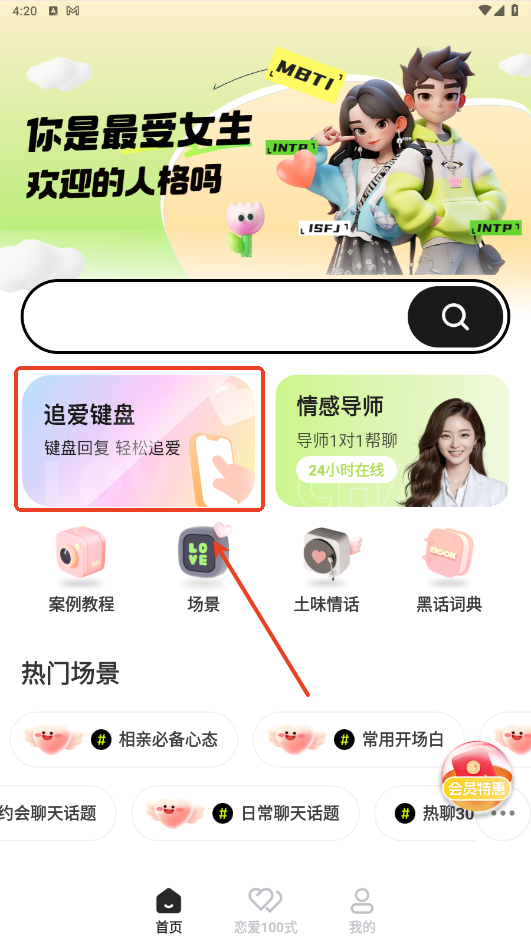 1.点击首页的追爱键盘。