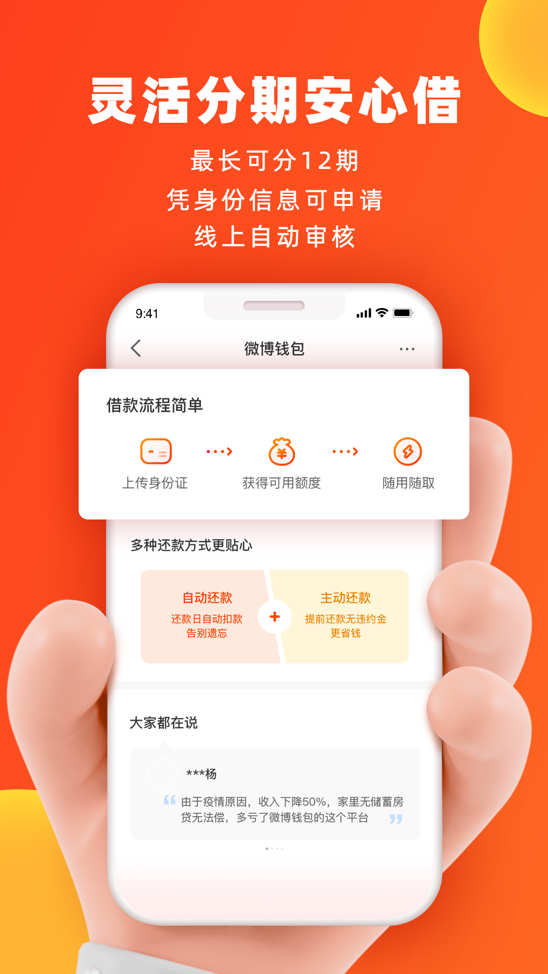 微博钱包app是一款由新浪微博受权官方平台,协作各大持牌消M金融企业,资质证书齐备,合规管理无招数,为您出示安全性、技术专业、智能化、方便快捷的小额贷款app贷款,消费借款、分期借款,短期借钱等业务流程。