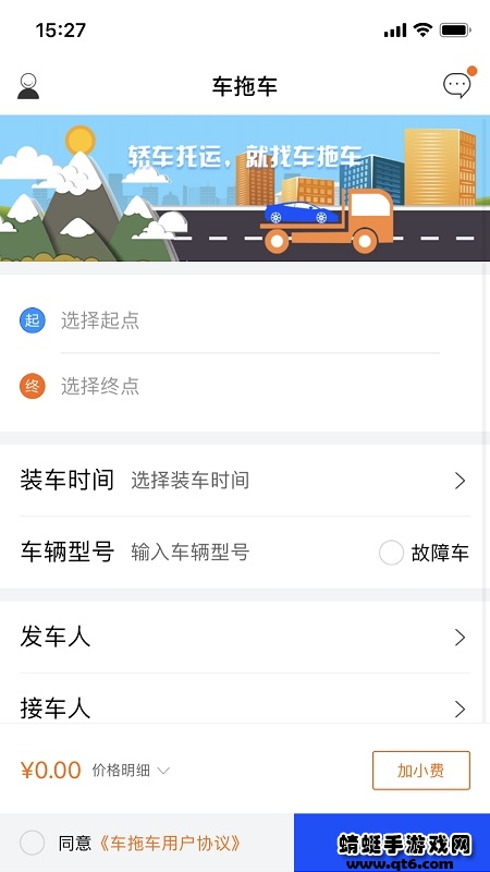 车拖车是一款汽车托运APP,专门为汽车托运服务的,有商运、旅运、救援等。填写位置信息,一键叫车,平台快速派单,轻松完成汽车托运。订单详情、运输状态都可以一键查询,价格合理,专业认证司机,一键拖车服务安全放心。