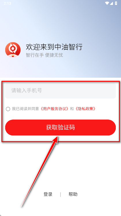 2.请输入手机号码,勾选我已阅读并同意《用户服务协议》和《隐私政策》。再点击获取验证码。