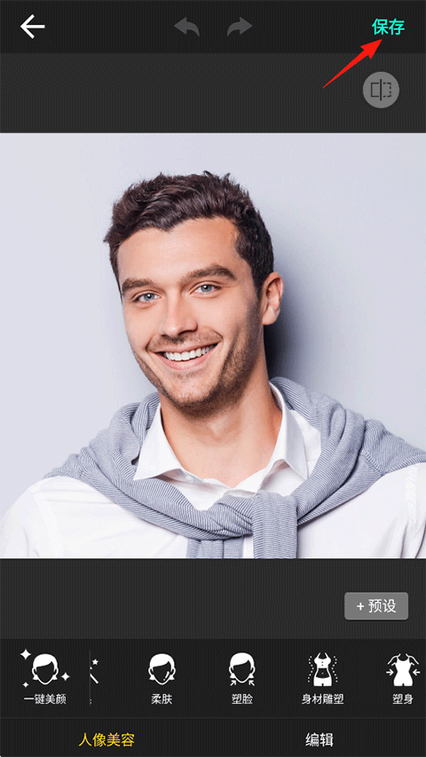 3、还可以对人像进行柔肤、型脸、身材塑形塑身等,完成后点击右上角保存;
