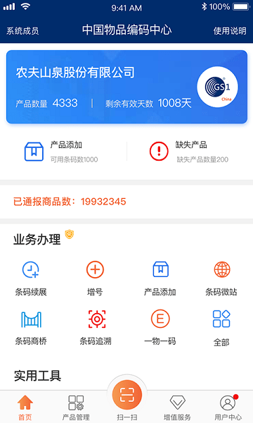 中国物品编码中心官方查询app内置业务办理和使用工具两大好帮手,可以帮助您快速的添加各类条形码,内置条码微站和商桥,还可以一键追溯它的来源,保证一物一码!
