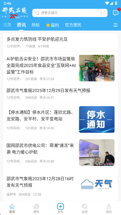 3、在便民板块中有生活类的服务,如求职招聘、美食吃货、平安邵武等
