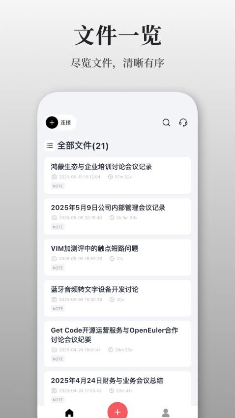 AuraNote app官方版是一款可以帮助用户智能管理录音的软件,你可以通过软件轻松的实现各种录音转写模式,让用户可以对自己的课堂录音、会议录音和采访录音进行一键转写,这样用户就能够获取对应的录音数据了,以后可以不同手动记录各种会议、课堂等内容,节省许多的时间与精力。AuraNote最新版还可以帮助用户实现手机数据同步,这样就算登录新的手机,也会同步最新的录音转写内容,并且平台支持多语言转写,让你可以对不同的语言内容进行一键快速转写,可以满足用户的翻译需求,需要的用户快来下载吧!