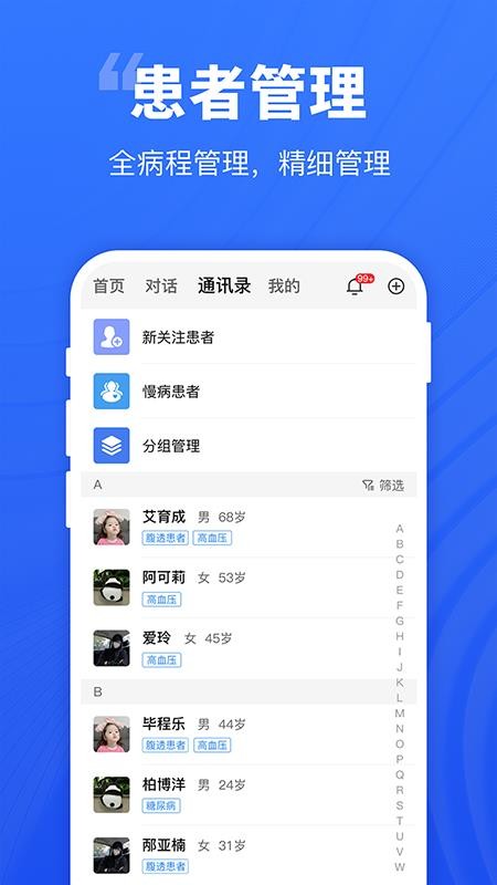 支持用户对自己的患者来实时管理,查看通讯录中的患者联系方式,实现分组管理。