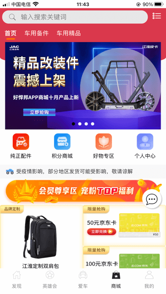 在“商城”,您可以购买各种精美的优质商品,享受各种优惠活动,保证纯正配件,让您的车辆得到最好的保障。