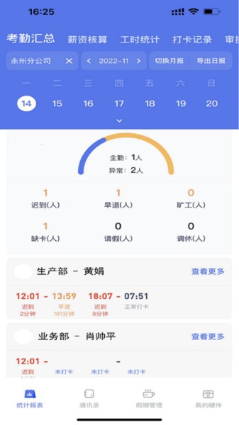 4.自动算薪:计时/计件,日薪/月薪每月工资统计清楚显示正班/加班/请假/缺勤时长,精准计算。