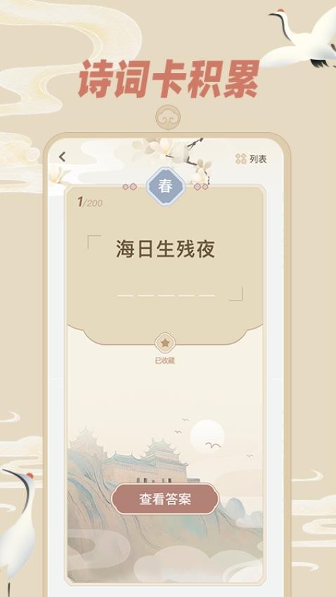 3、在诗词卡积累页面,就能通过诗词答出正确答案,并能收藏和查看答案