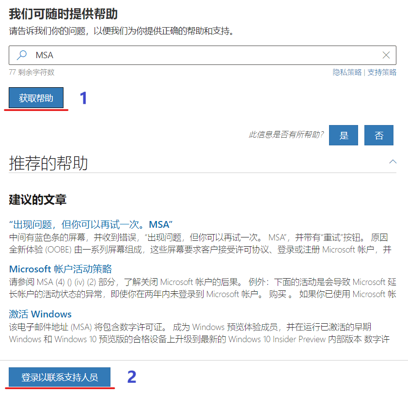 2. 请您输入 MSA,点击 ”获取帮助“>“登录以联系支持人员” 按钮,登录您的 Microsoft 账户 (如下图)。