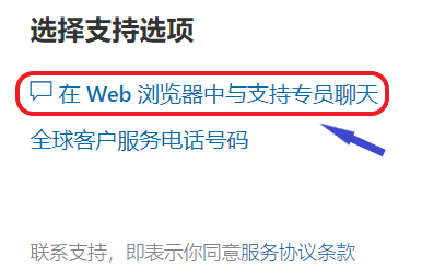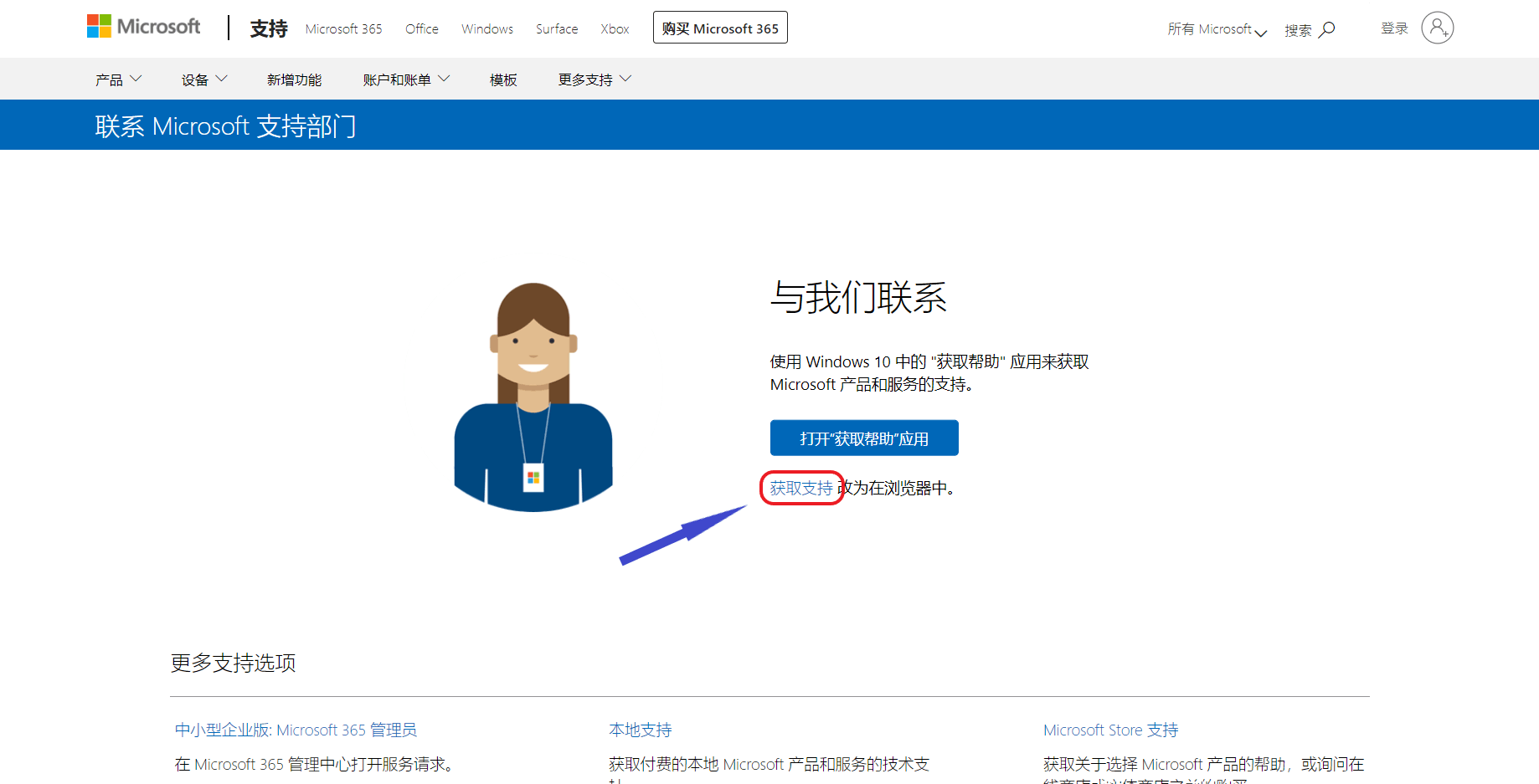 1. 点击「此处」联系 Microsoft 支持部门,点击 ”获取支持“ 按钮 (如下图)。