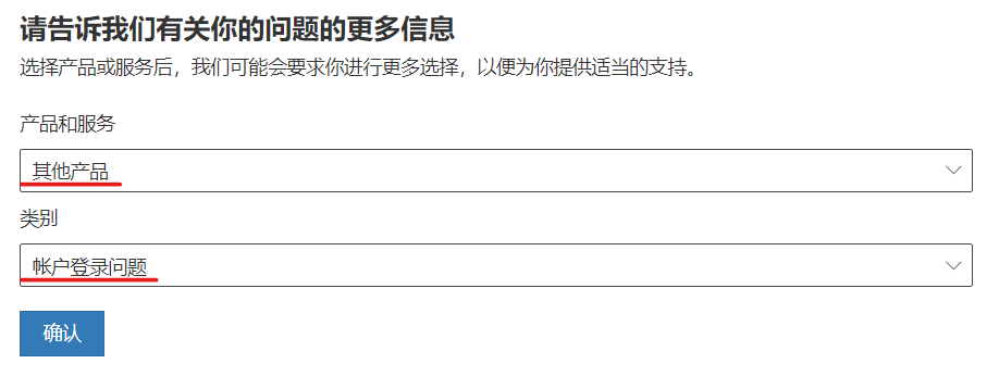 3. 请您选中 ”其他产品“>”账户登录问题“ 类别,点击 ”确认“>”在 Web 浏览器中与支持专员聊天“ 按钮即可联系 Microsoft 账户 (MSA) 工程部门 (如下图)。烦请您以 Microsoft 工作人员最终答复结果为准。