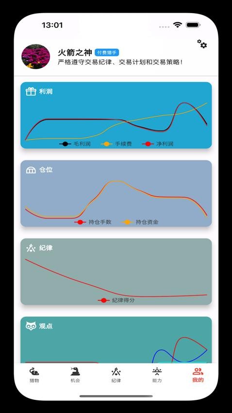7、行为数据洞察,包含对核心交易能力、收益、仓位、猎物、纪律、观点、机会、策略、决策、复盘、日记等方面的全面数据洞察和分析;