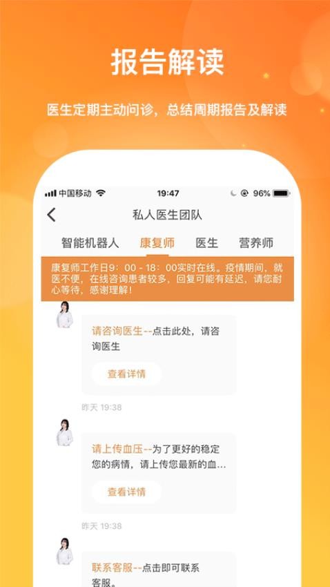 365天实时在线的康复师,可以为患者解答各种报告问题,必要时转诊医生及时干预指导。