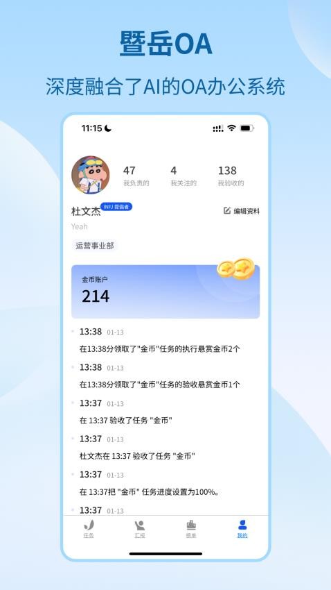 暨岳OA软件是一款为用户提供企业管理的oa办公系统软件,软件支持用户可以在线随时进行企业管理,一键查看关于企业员工的每日任务,更好的进行任务查看,方便用户可以随时随地的进行办公,就可以在线对任务进行派发和验收,轻松处理,助力用户提高办公的效率。平台还展示了关于员工任务的排行榜,用户可以在线查看相关的排行,对任务完成率较高的员工可以进行查看,更好的进行掌握。此外,暨岳OA手机版还在想用户可以在线实现工作汇报,查看员工的报告记录,轻松进行汇总,在线进行企业的管理,有需要的用户就赶紧来本站下载使用吧!