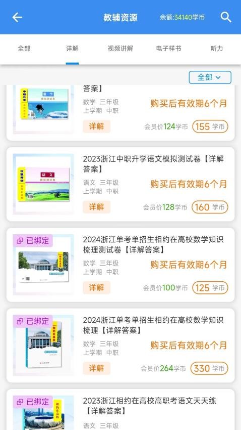 教辅资源模块提供了详解、视频、电子书、听力共四类内容载体,极大的丰富了学生的练习学习方式。