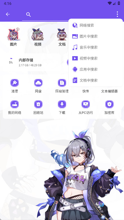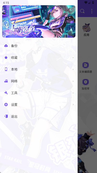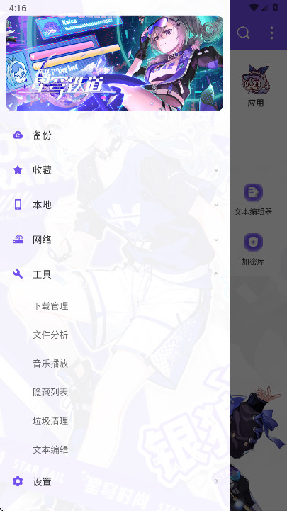 1.打开ES管理器,可以看到,软件的风格都变成了二次元的风格,首页主要有网盘、压缩管理、文本编辑器、加密库等等功能。