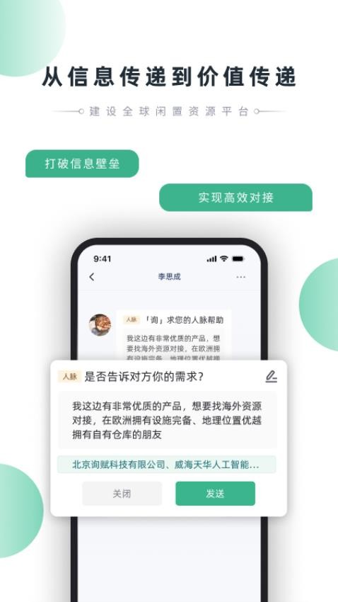 询赋APP官网版是一款能帮助用户链接更多人脉资源的社交软件,平台汇集了诸多优质资源类型,可自由在线翻看可能感兴趣的内容,喜欢的项目和发布者可在线联系,帮助你能快速找到合作伙伴,轻松拓展更多创业资源;强大的AI技术功能,在应用中可通过对话的方式查询符合条件的人脉,便于找到优质资源,找合作以及展业更轻松高效;同时可在线实现AI名片交换,便于知晓对方的信息和联系方式,日常联系更方便;有兴趣的伙伴欢迎在线下载询赋最新版APP使用,帮助你打破信息的壁垒,实时都能在应用中开启高效的业务对接!