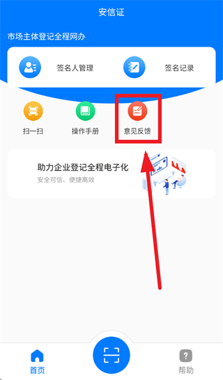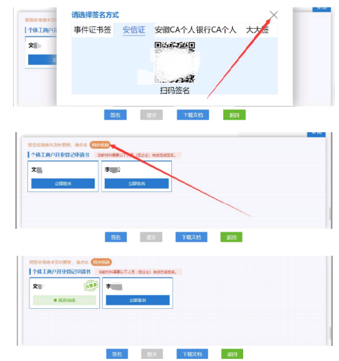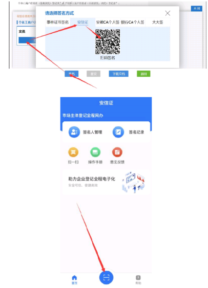 通过企业登记全程电子化系统签名页面,选择安信证签名,将弹出二维码,您需要通过手机打开安信证APP并点击APP内扫码按钮,扫描页面二维码。