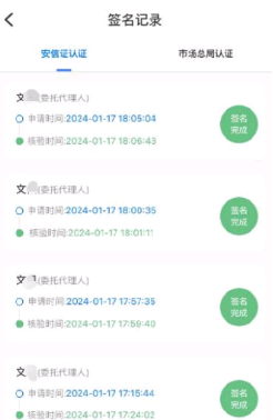 答:签名完成后在首页点击签名记录,可以查看安信证认证和市场总局认证签名已完成的记录。