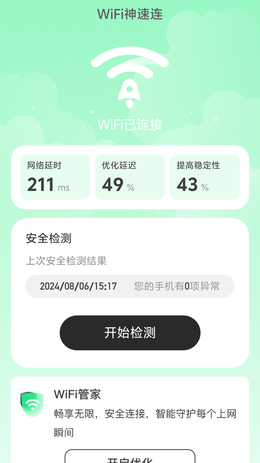 打开WiFi神速连app,进入后点击开始检测
