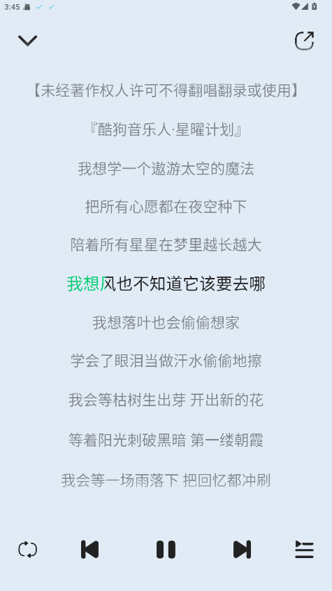 6.每首歌曲配有同步歌词,帮助用户跟随歌曲一起唱,增强互动体验。
