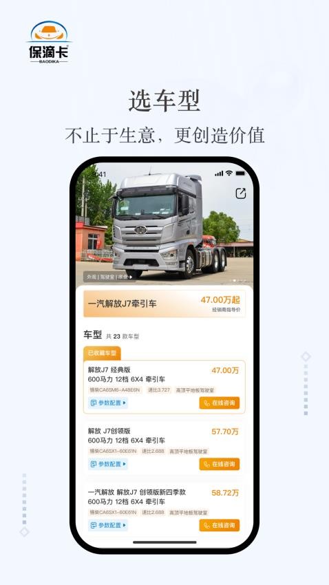 保滴卡app最新版是一款专注于卡车交易服务的软件,软件中将海量的车源实时推荐,将各种车型全面覆盖,用户可以在这里轻松选购各种车型车辆,还可以直接在线向商家咨询了解更多车辆信息对接交易,用户在线选车购车可以享受平台补贴福利,以最实惠的价格购买到你想要的卡车,各种品牌车型的卡车这里应有尽有,用户可以尽情选购,随时都能选购到你满意的卡车购买,不仅提供有大量的新车资源,还提供有大量的二手车资源,可支持用户在线购买二手车,享受一体化的选车购车体验,有需要的用户就快来下载保滴卡免费版使用!