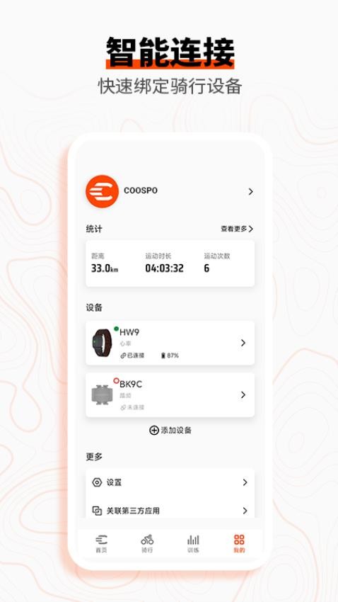 COOSPO运动app官方版是专为骑行爱好者打造的骑行记录工具,通过软件就可以对你的骑行速度、时长、热量消耗等进行记录,让用户可以清楚的知道自己的骑行情况,以后就能够更好的进行骑行管理,这样才能够满足用户的骑行记录需求,通过查看骑行数据,就能够对自己的骑行进行优化提升,帮助用户提升骑行水平。COOSPO运动最新版还可以与智能的硬件设备进行互动连接,这样才可以让你获取更多的数据信息,让用户可以轻松对不同的数据进行无缝同步,让你能够掌握更多的细节,以后就可以获取更精准的骑行数据,让你更好的训练自己!