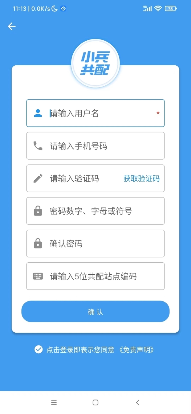 点击右下角【立即注册】――填写个人账户信息,注意需要输入【5位共配网点编码】,若是不知道可以咨询共配官方客服微信号:xbyz007,或者拨打共配官方客服电话:0551-64933840转共配;