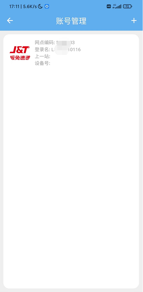 (3)业务员拿到管理员新建的共配账户后,点击【我的】――【帐号管理】――点击右上角+,绑定对应快递公司工号;